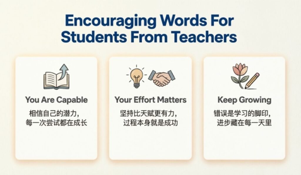 Encouraging words from teachers inspire confidence and resilience in students. Their guidance strengthens determination, supports character development, and motivates learners to overcome challenges while continuing their educational growth and meaningful life journey.